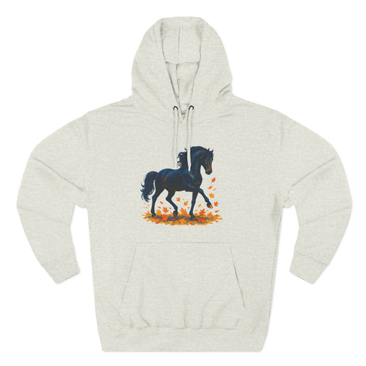 A cozy hoodie featuring a design of a horse dancing through a pile of autumn...